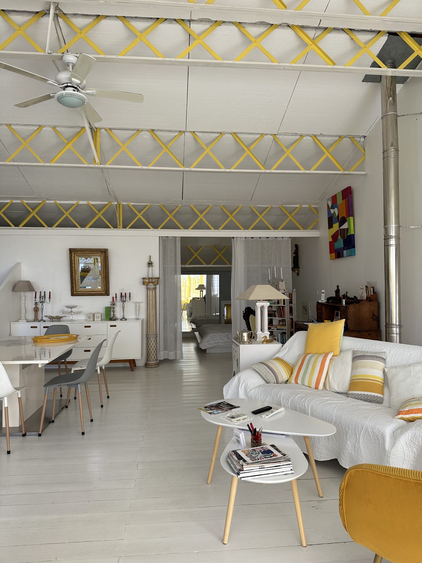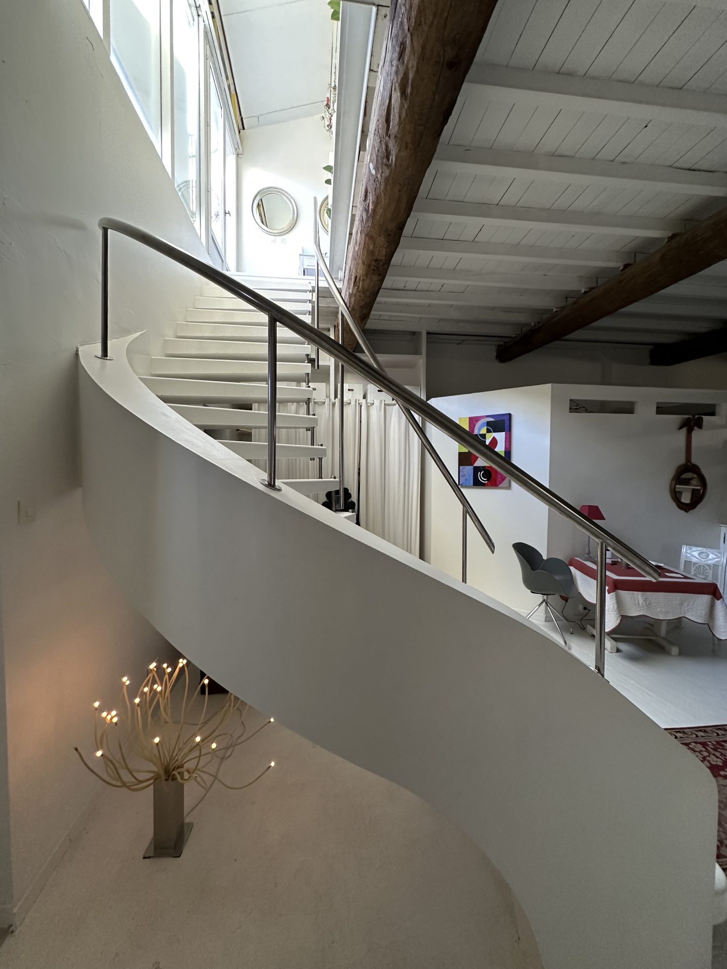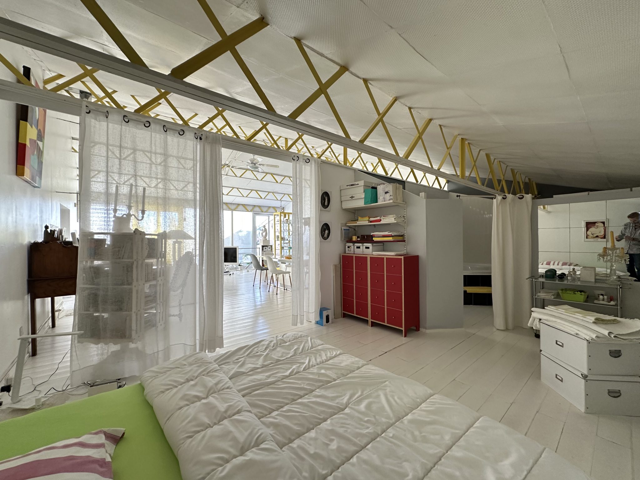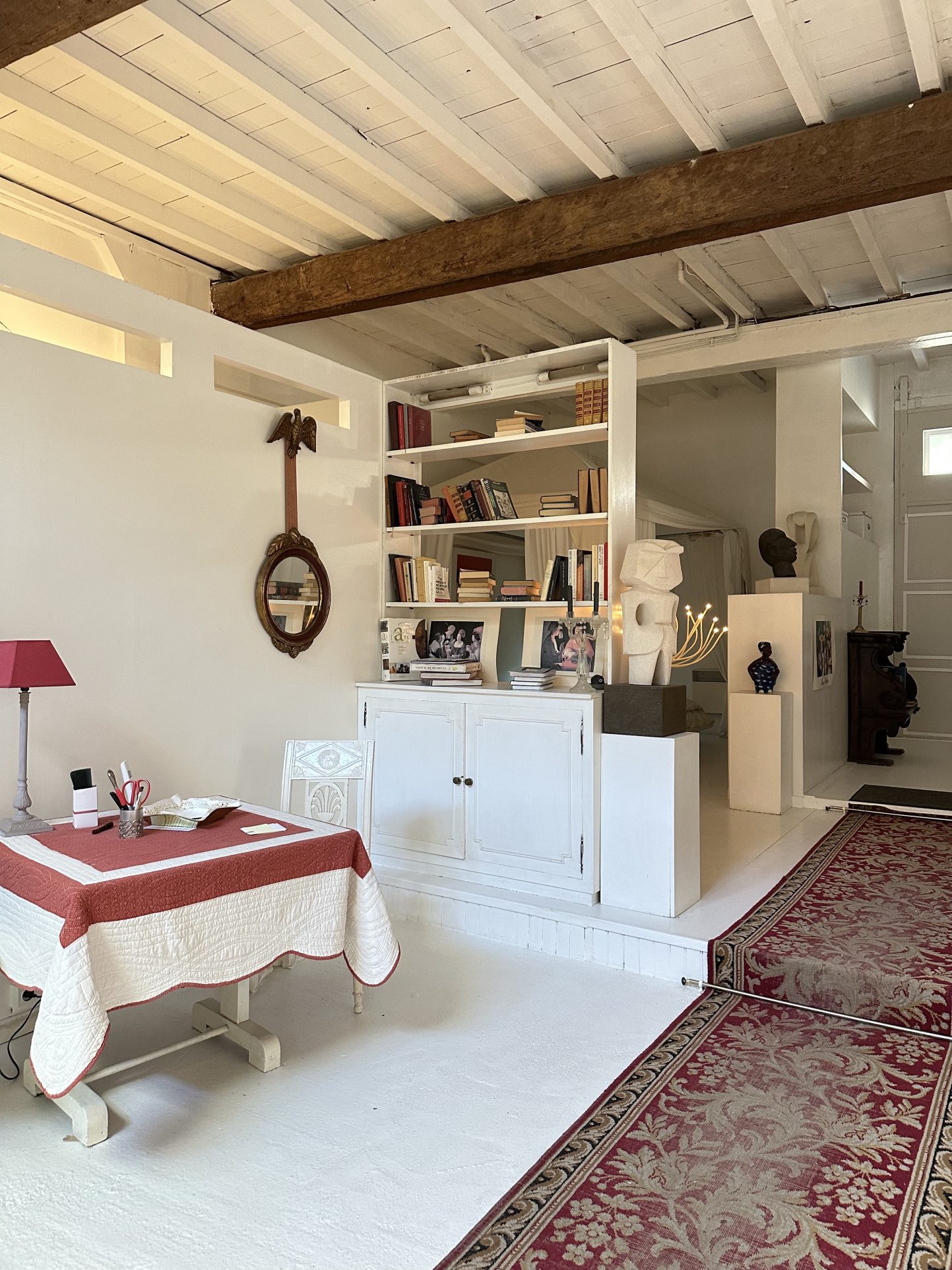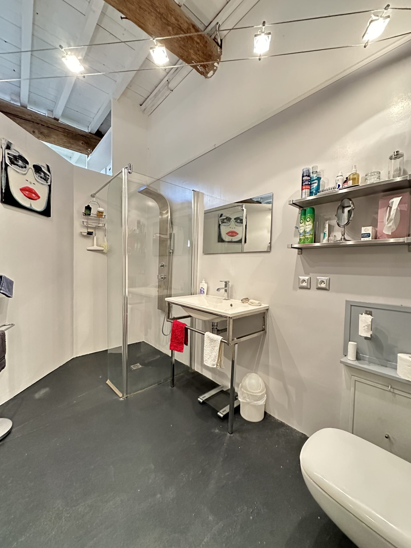 Le rez-de-chaussée, façon loft, offre un bel espace avec chambre, salle d’eau et plafonds hauts — idéal pour une activité libérale ou un atelier.