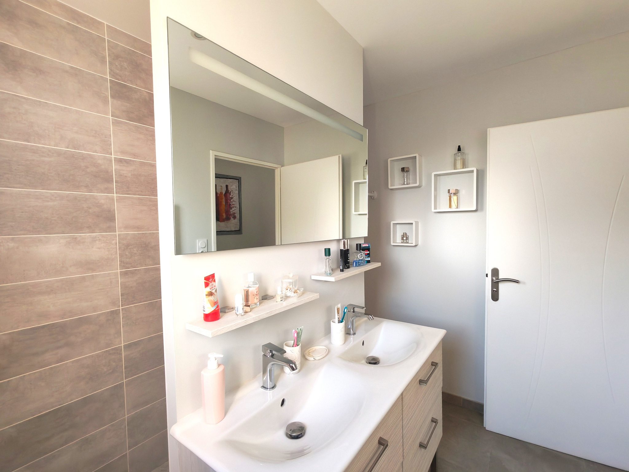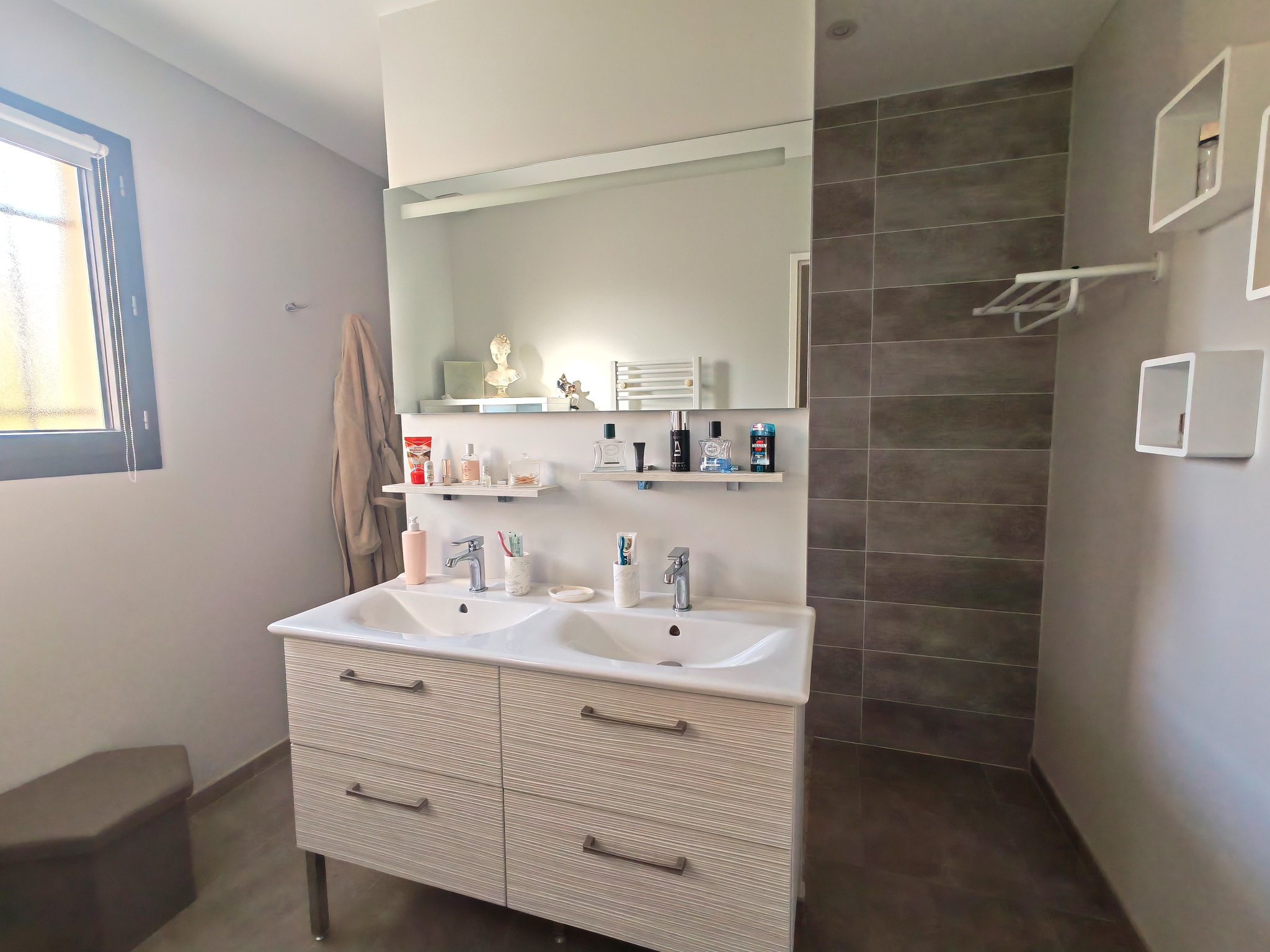 L’espace nuit se compose de deux chambres avec rangements, d’un dressing indépendant, d’une salle d’eau contemporaine et de toilettes séparés. Les prestations techniques répondent aux standards actuels : RT 2012, climatisation gainable, cumulus thermodynamique, vide sanitaire accessible, alarme, visiophone et adoucisseur d’eau. Installation récente de panneaux solaires avec revente.